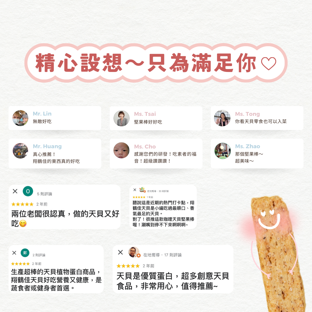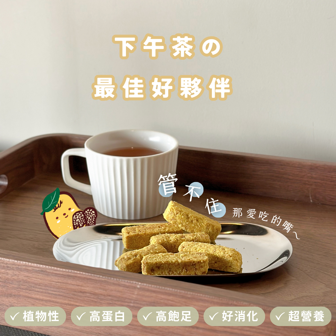 本公司與輔英科技大學以及國立金門大學合作研發,篩選來自旗山香蕉葉上天貝菌種,以十幾種豆穀類與天貝菌發酵而成的天貝,加上綠香蕉的低GI、膳食纖維以及抗性澱粉,非常適合做為日常健康休閒食品。什豆天貝粉(十幾種豆穀類發酵而成)、綠香蕉、堅果粉,皆是營養健康優質食材