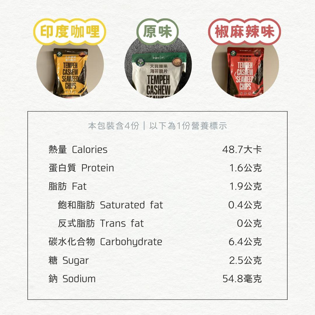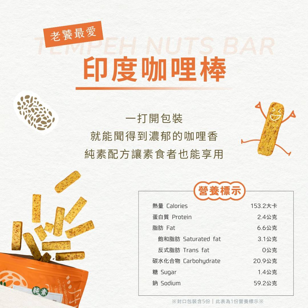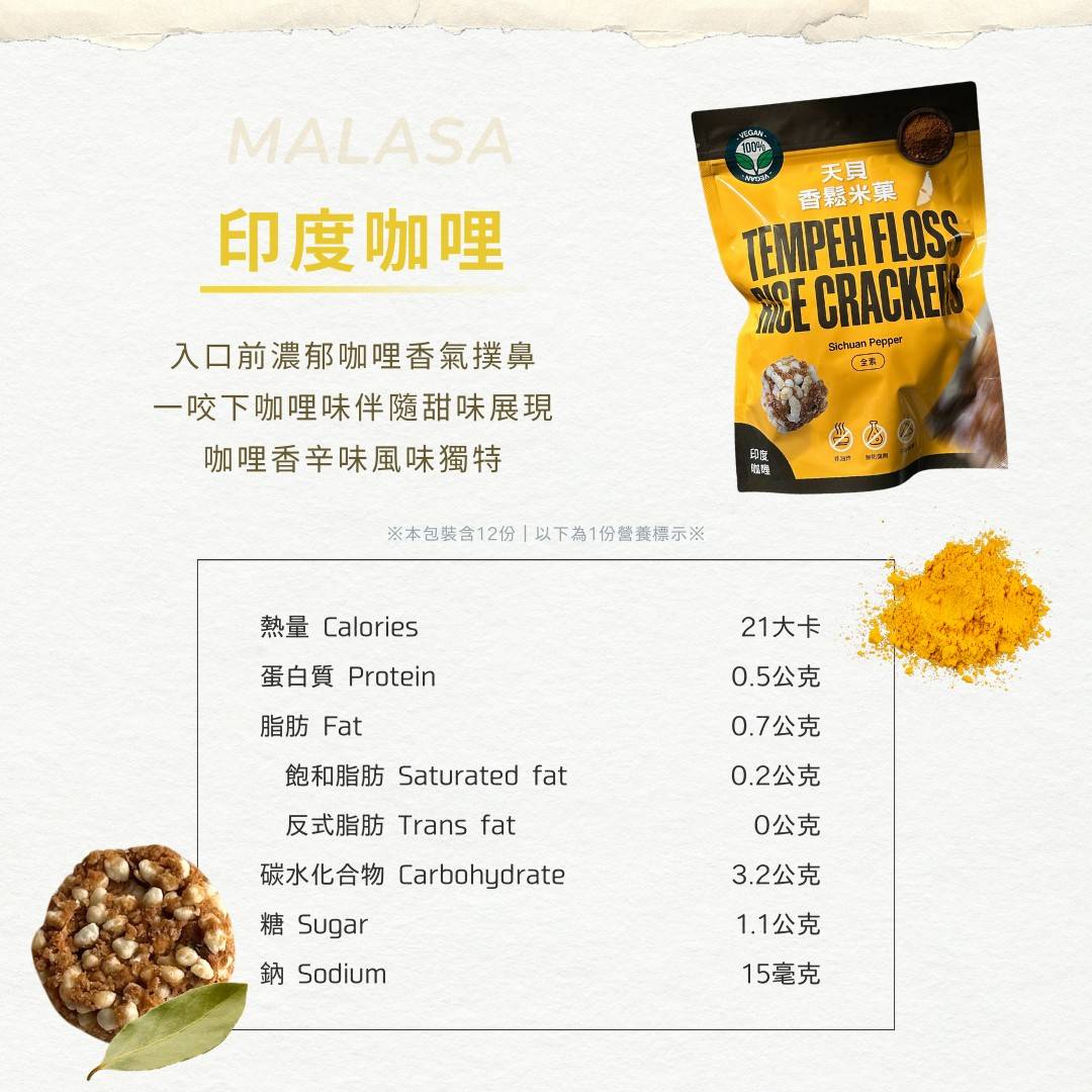 選用天然發酵天貝,富含植物性蛋白與膳食纖維,搭配印度咖哩香料的獨特風味,辛香濃郁,層次豐富。全程無添加人工色素與防腐劑,健康又安心。酥脆口感與香料的完美結合!