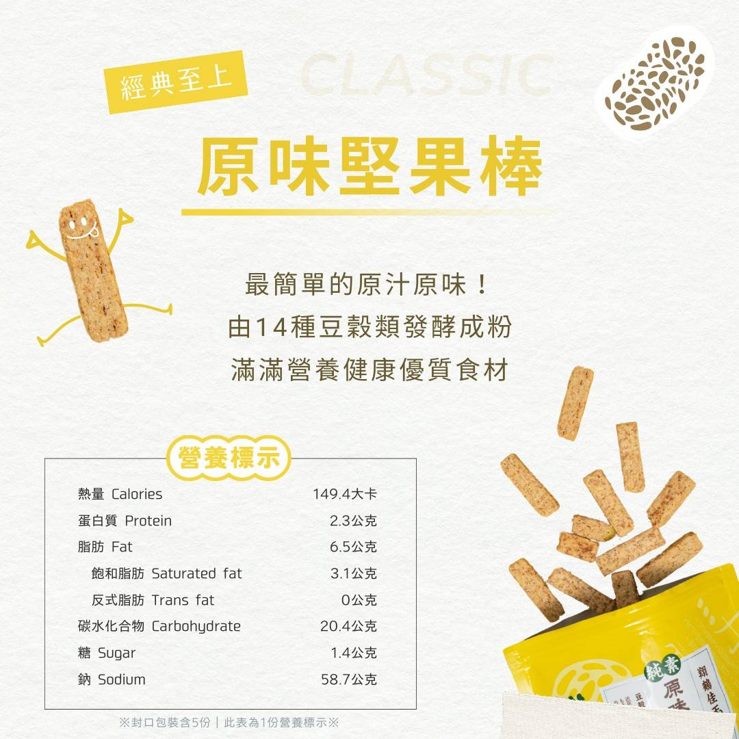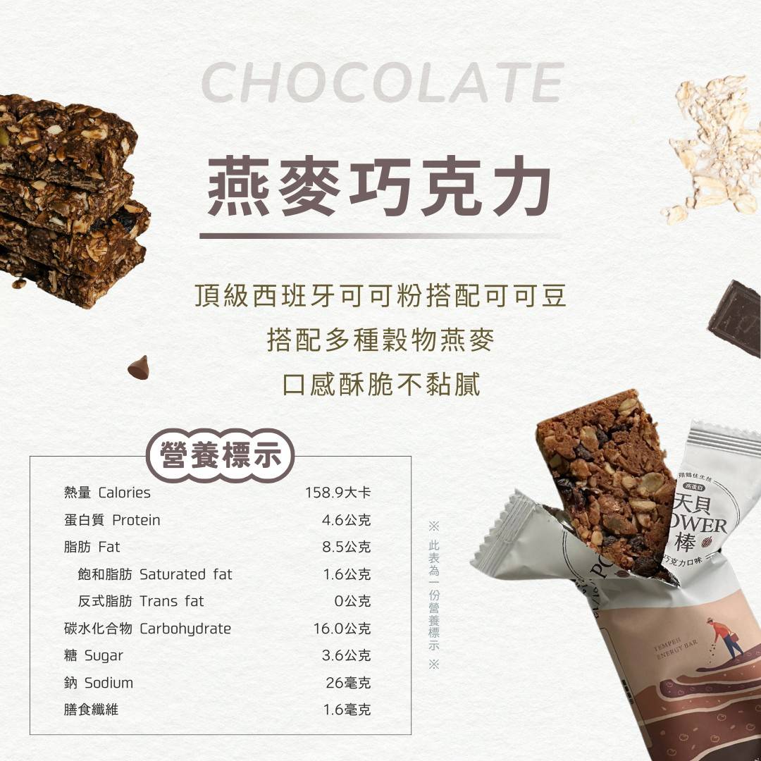 本公司與輔英科技大學以及國立金門大學合作研發,篩選來自旗山香蕉葉上天貝菌種,以十幾種豆穀類與天貝菌發酵而成的天貝,加上綠香蕉的低GI、膳食纖維以及抗性澱粉,非常適合做為日常健康休閒食品。什豆天貝粉(十幾種豆穀類發酵而成)、綠香蕉、堅果粉,皆是營養健康優質食材